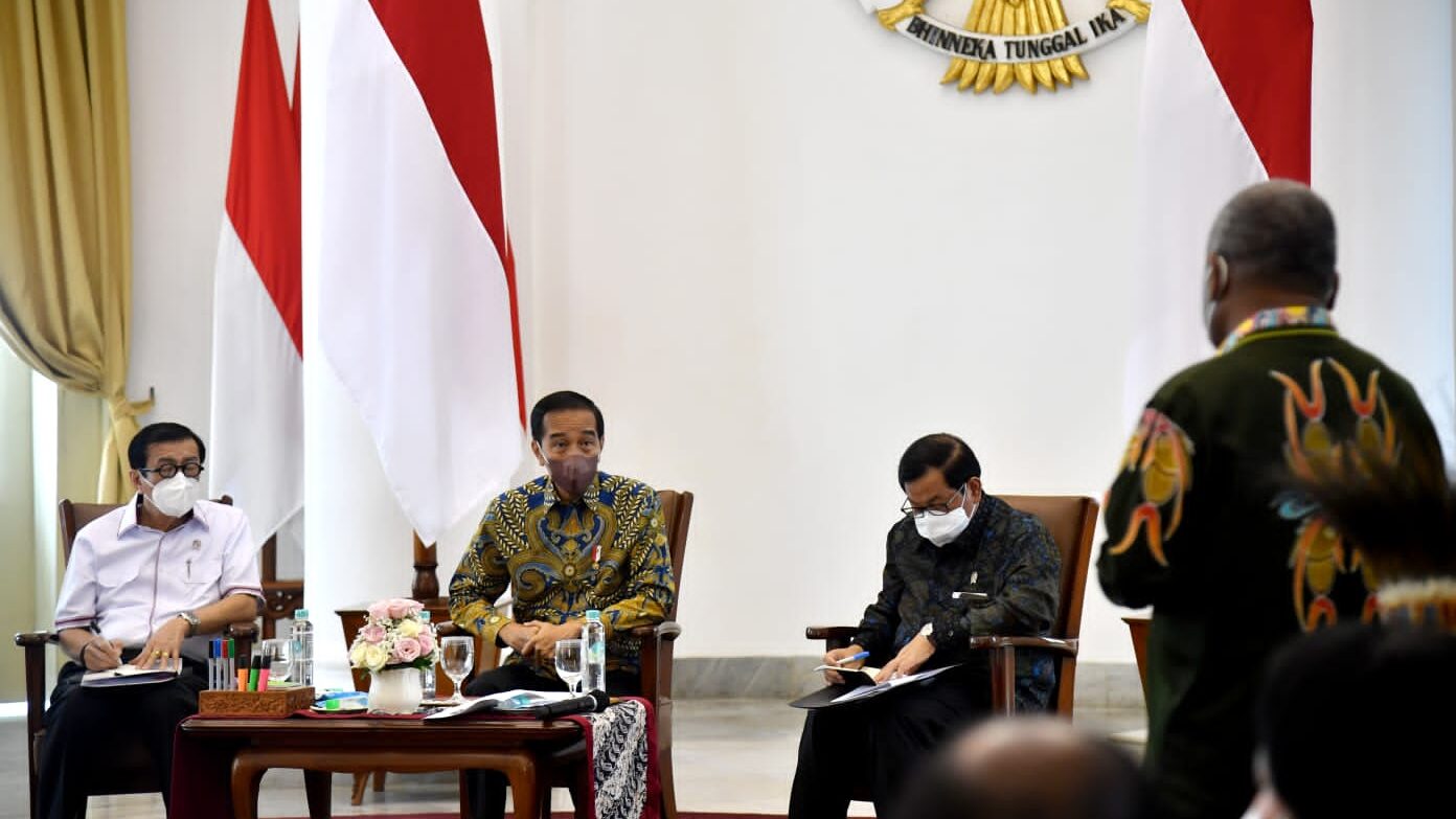 Presiden Joko Widodo menerima Majelis Rakyat Papua (MRP) dan Majelis Rakyat Papua Barat di Istana Kepresidenan Bogor, pada Jumat, 20 Mei 2022. Bupati Jayapura Mathius Awoitauw yang mewakili rombongan mengatakan bahwa pihaknya mengapresiasi pertemuan dengan Presiden Jokowi yang membahas soal daerah otonomi baru (DOB) di Papua.