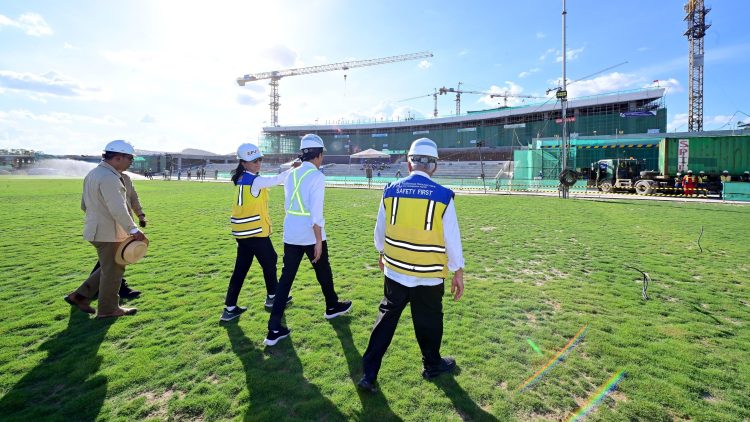 Presiden Joko Widodo meninjau langsung lapangan upacara berikut Istana Presiden di Kawasan Ibu Kota Nusantara, Kabupaten Penajam Paser Utara, Provinsi Kalimantan Timur, Kamis, 29 Februari 2024. Peninjauan dilakukan antara lain untuk mengecek kesiapan pelaksanaan Upacara Peringatan ke-79 Kemerdekaan Republik Indonesia pada 17 Agustus 2024 mendatang.