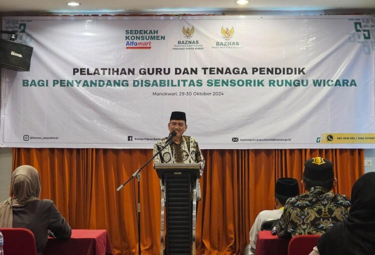 JAKARTA, WT – Badan Amil Zakat Nasional (BAZNAS) RI menyelenggarakan pelatihan guru dan tenaga pendidik melalui program Training of Trainers (ToT) Al-Qur’an Isyarat khusus bagi penyandang disabilitas sensorik rungu-wicara di Papua Barat. Pelatihan ini diadakan di Hotel Valdos, Manokwari, Papua Barat, pada Selasa (29/10/2024) dan dibuka oleh Pimpinan Bidang SDM, Keuangan, dan Hukum BAZNAS RI, Kol. CAJ (Purn) Drs. Nur Chamdani.