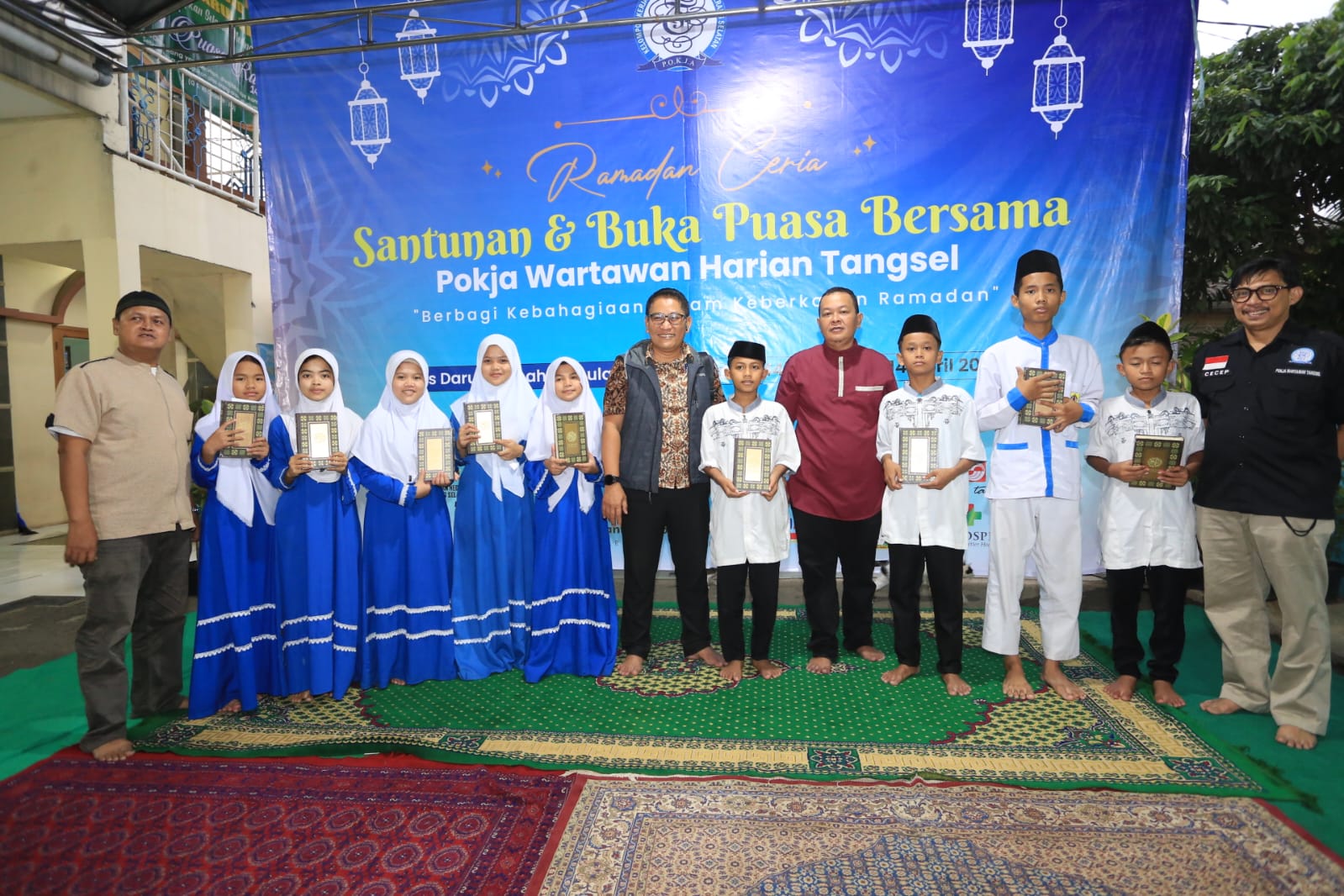 TANGSEL, WT – Kelompok Kerja (Pokja) Wartawan Harian Kota Tangerang Selatan (Tangsel) memanfaatkan Bulan Suci Ramadan 1.444 Hijriah sebagai momentum untuk saling menebar kebahagiaan melalui kegiatan santunan anak yatim dan buka puasa bersama di MTs Daarul Hikmah Pamulang, Tangsel, Jumat (14/4/2023).
