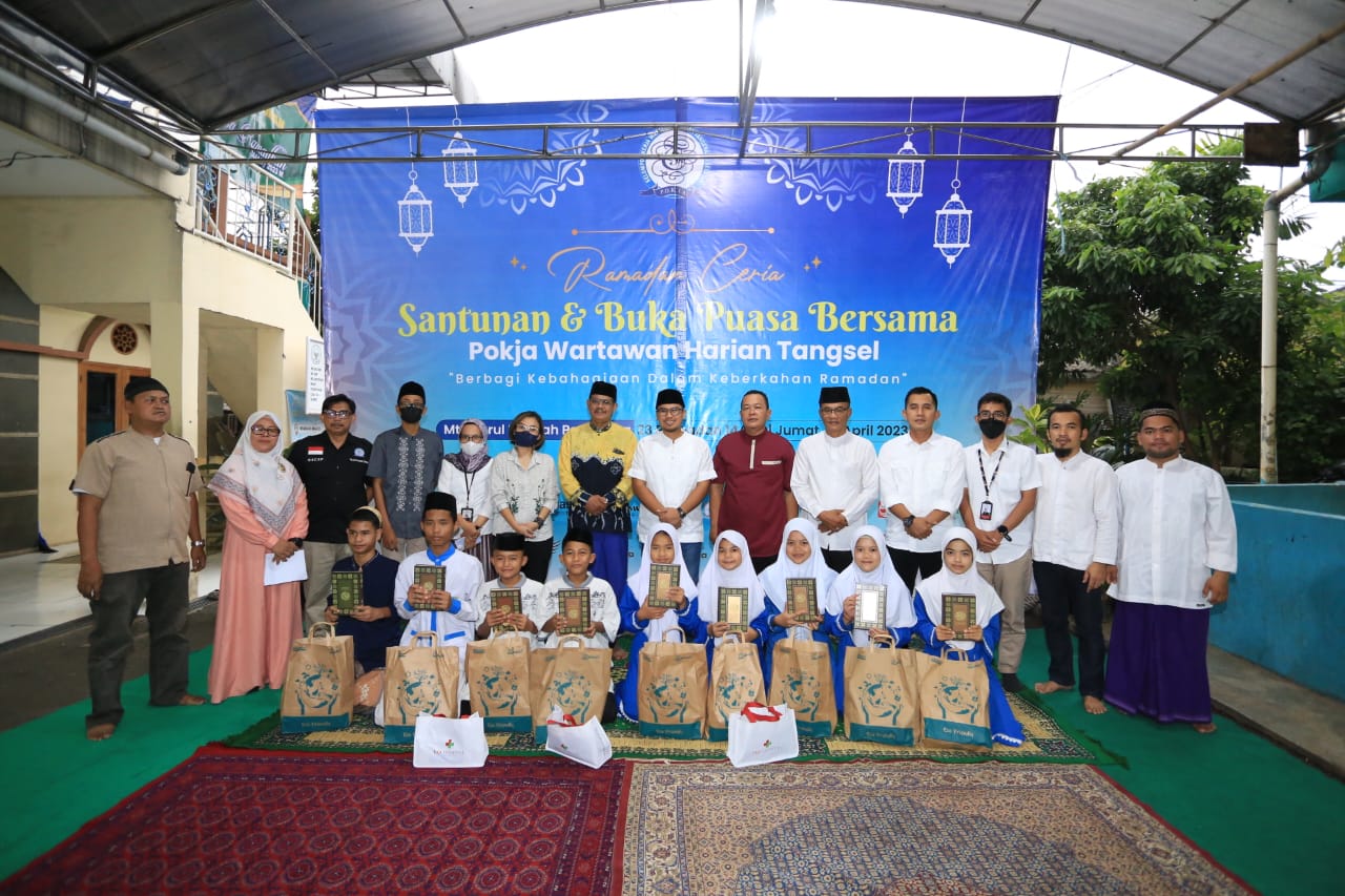 TANGSEL, WT – Kelompok Kerja (Pokja) Wartawan Harian Kota Tangerang Selatan (Tangsel) memanfaatkan Bulan Suci Ramadan 1.444 Hijriah sebagai momentum untuk saling menebar kebahagiaan melalui kegiatan santunan anak yatim dan buka puasa bersama di MTs Daarul Hikmah Pamulang, Tangsel, Jumat (14/4/2023).