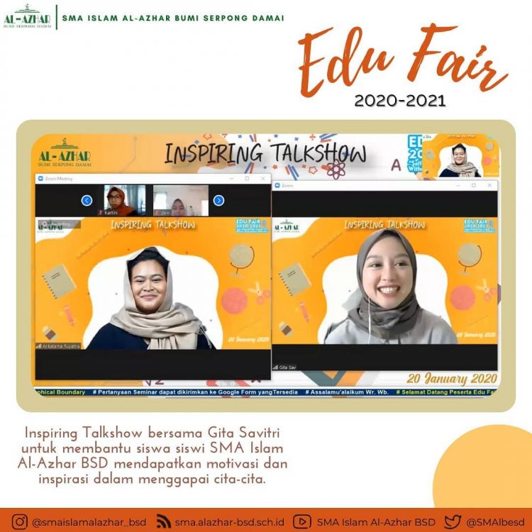 TANGSEL – Puncak kegiatan Edufair 2021 SMA Islam Al Azhar BSD ditutup dengan penuh inspirasi dari Youtuber sekaligus konten creator, Gita Savitri.