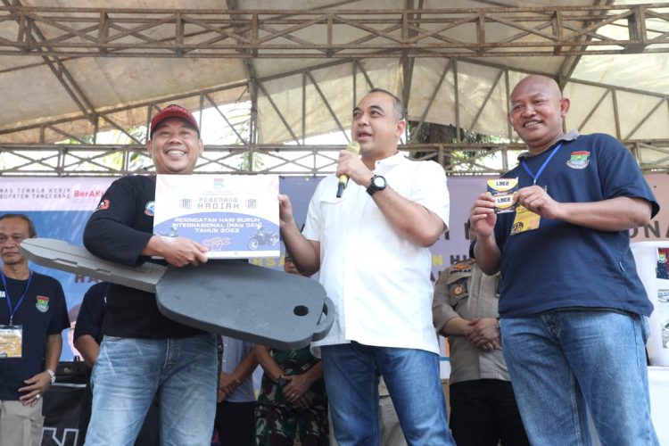 TANGERANG, WT – Bupati Tangerang Ahmed Zaki Iskandar menghadiri dan membagikan doorprize di puncak perayaan Hari Buruh atau May Day diikuti ribuan buruh tersebut digelar Puspemkab Tangerang, Sabtu (6/5/2023).
