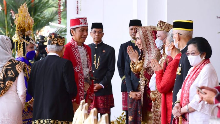 Presiden Joko Widodo mengenakan baju adat Dolomani asal Buton, Provinsi Sulawesi Tenggara pada Upacara Peringatan Hari Ulang Tahun (HUT) ke-77 Kemerdekaan RI pada Rabu, 17 Agustus 2022. Tak hanya Kepala Negara, para pembantunya di Kabinet Indonesia Maju ikut serta memeriahkan HUT ke-77 Kemerdekaan RI dengan mengenakan pakaian adat dari berbagai daerah di Tanah Air.