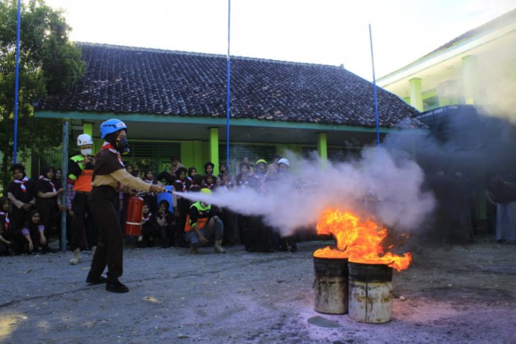 Para siswa dan siswi SMP 1 Piyungan juga berkesempatan untuk memadamkan api dalam drum menggunakan kain basah dan APAR.
