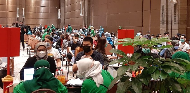 TANGERANG – Sebanyak 1.600 pedagang dan pegawai tenant pusat perbelanjaan, pegawai Novotel, Skandinavia Apartemen, dan Tangcity Superblock, divaksinasi Covid-19 tahap kedua, di Ballroom Novotel, Kota Tangerang, Senin (15/3/2021).