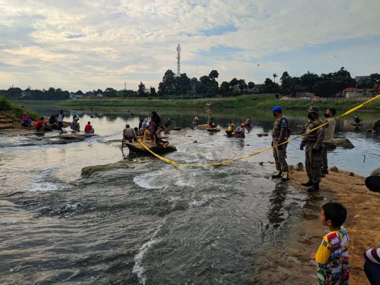 TANGSEL-Petugas Satpol PP Tangsel akhirnya menutup lokasi wisata air terjun mini yang berada di Situ Lengkong Wetan, Serpong, Tangsel, pada Rabu (17/8/2020).