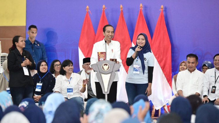 Presiden Joko Widodo bersilaturahmi dengan nasabah program Mekaar Binaan Permodalan Nasional Madani (PNM) di GOR Basket Bekasi, Kota Bekasi, Provinsi Jawa Barat, pada Jumat, 16 Februari 2024.