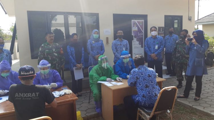 TANGERANG-Sebanyak 41 staf dan pimpinan Kecamatan Pasar Kemis Kabupaten Tangerang ikut rapid test covid-19 di halaman Kantor Kecamatan Pasar Kemis, Rabu (17/6/2020).