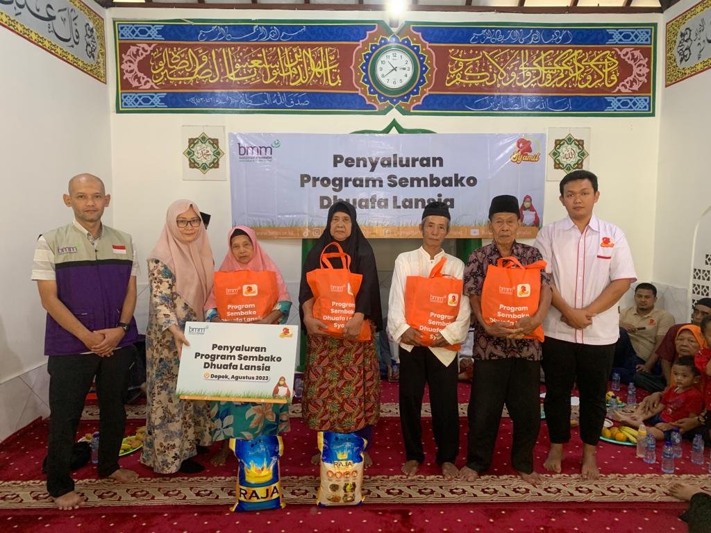 DEPOk, WT – Lembaga Amil Zakat Nasional (Laznas) Baitulmaal Muamalat (BMM) bersama Syamil Aqiqah menyalurkan zakat berupa sembako dan santunan uang tunai sebanyak 26 paket untuk dhuafa lansia di Musholla Babussalam Kampung Rawakalong, Kelurahan Grogol, Kecamatan Limo, Kota Depok, Jawa Barat pada Rabu (30/8/2023).
