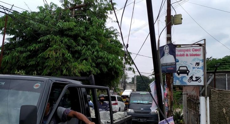 TANGSEL-Semrawutnya kabel listrik yang berada di Jalan Komplek Pertanian, Serua, Ciputat, Tangsel, kembali tersangkut truk tanah hingga menjuntai di tengah jalan yang menyebabkan kemacetan panjang di kedua arah, Senin (22/6/2020).
