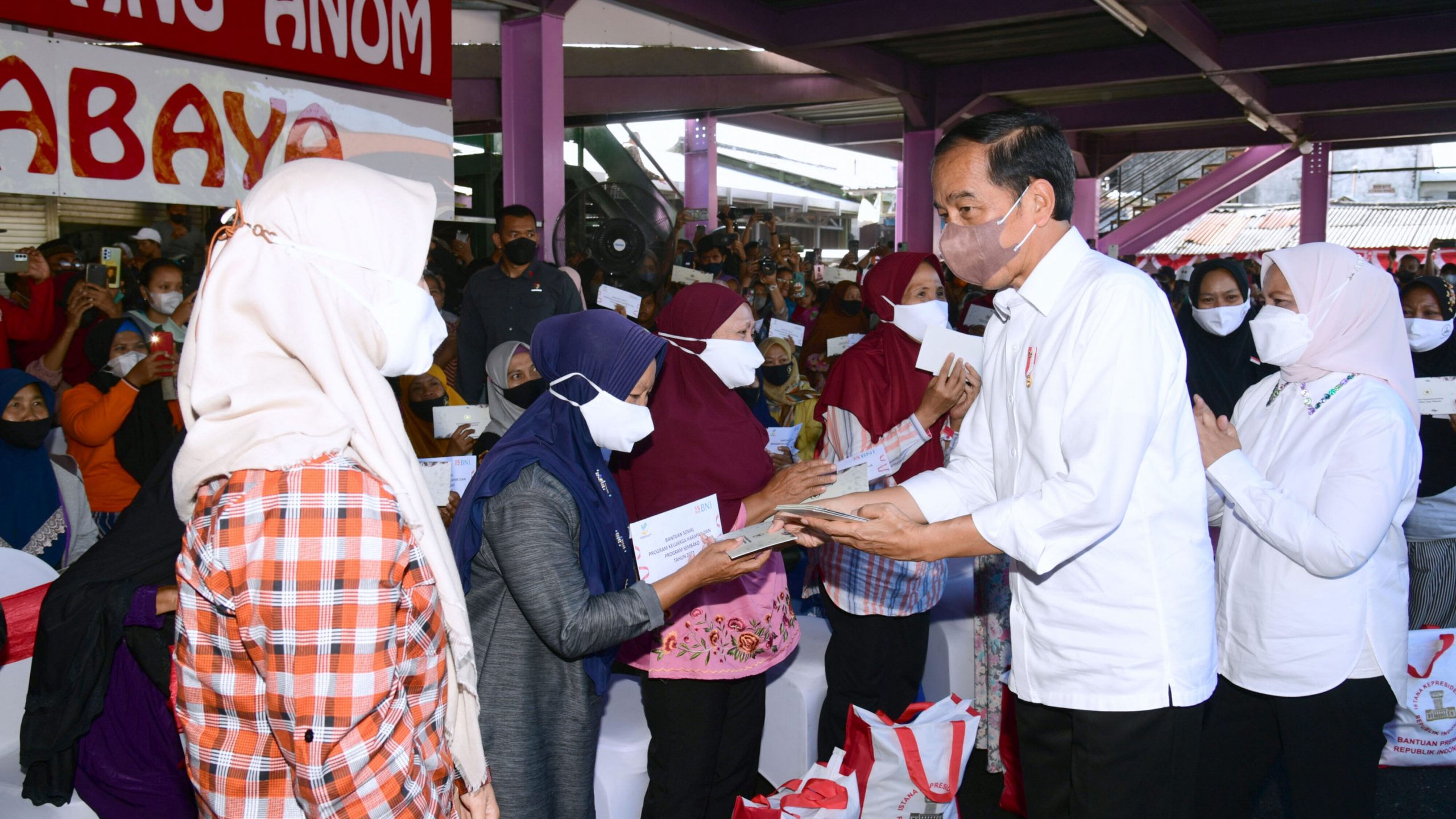 Presiden Joko Widodo didampingi Ibu Iriana Joko Widodo mengunjungi Pasar Pucang Anom, Kota Surabaya, pada Minggu, 21 Agustus 2022. (WT/rls)