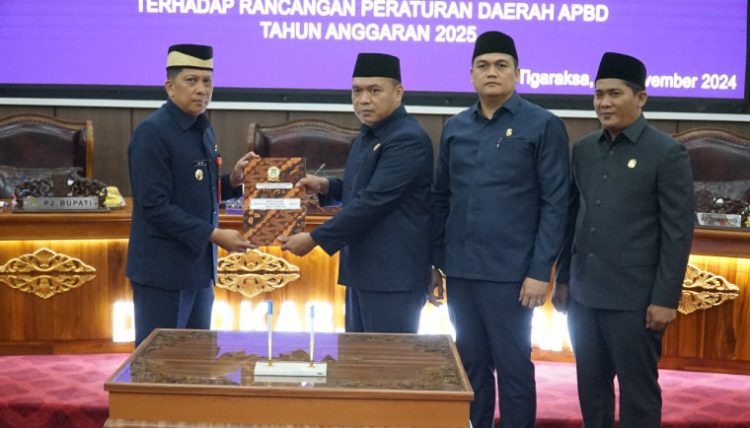 TANGERANG, WT – DPRD Kabupaten Tangerang menyetujui Rancangan Peraturan Daerah (Raperda) Anggaran Pendapatan dan Belanja Daerah (APBD) Tahun Anggaran 2025 untuk menjadi Peraturan Daerah (Perda). Persetujuan tersebut disahkan melalui Rapat Paripurna yang digelar pada Senin, (25/11/2024) setelah seluruh fraksi menyampaikan pandangan akhir. Penandatanganan berita acara persetujuan dilakukan oleh pimpinan DPRD bersama Penjabat (Pj) Bupati Tangerang.