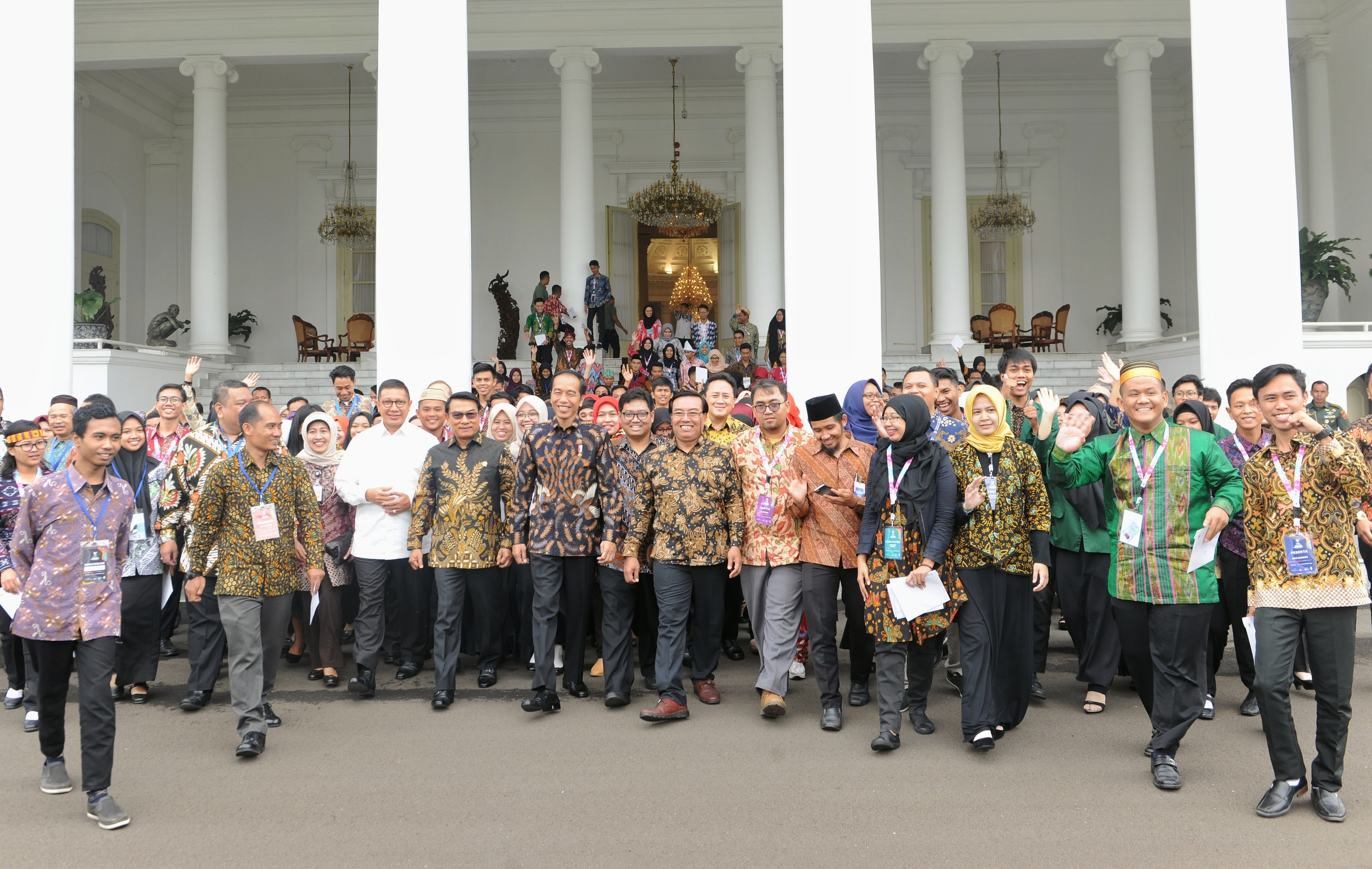 Presiden Jokowi didampingi sejumlah pejabat berjalan bersama peserta Kongres Indonesia Millenial Movement Tahun 2018 di Istana Kepresidenan Bogor, Jawa Barat, Senin (12/11) pagi. (Foto: Humas/Anggun)