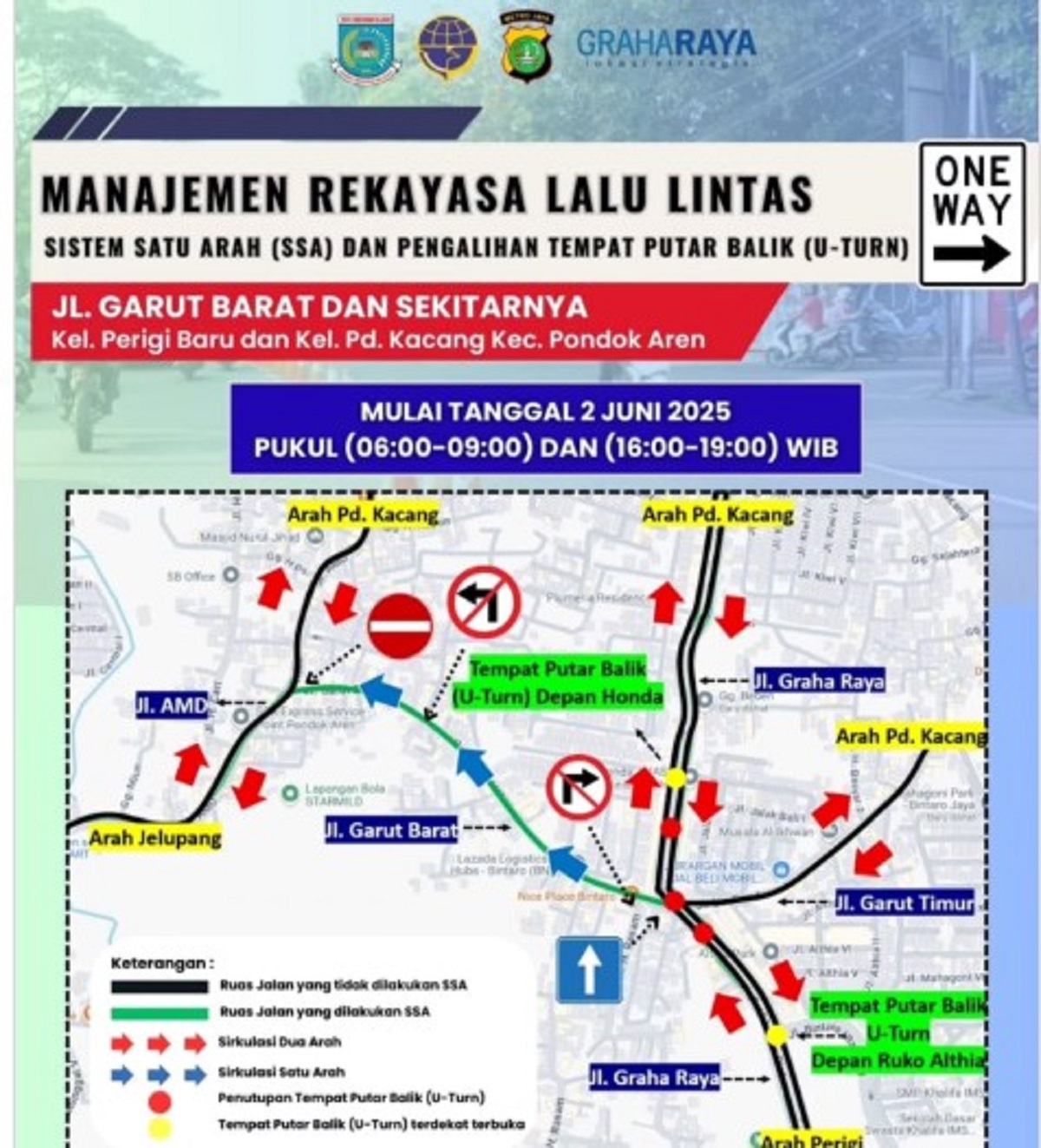 TANGSEL, WT – Pemerintah Kota Tangerang Selatan terus berupaya mengatasi permasalahan kemacetan lalu lintas yang kerap terjadi di sejumlah titik padat kendaraan. Salah satu langkah yang diambil adalah dengan melakukan uji coba Sistem Satu Arah (SSA) di Jalan Garut Barat, Kecamatan Pondok Aren.