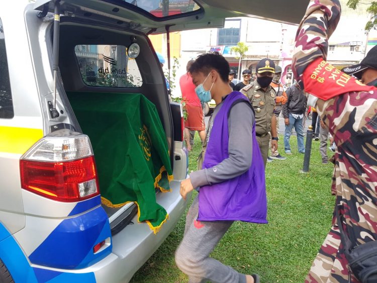 TANGERANG – Abaikan protokol kesehatan yakni tidak memakai masker, 72 pelanggar diberi sanksi masuk mobil jenazah. Sanksi tersebut diberikan saat Operasi Yustisi yang digelar pihak kepolisian bersama Pemkab Tangerang dan Kodim 0510 Tigaraksa di Kawasan Citra Raya, Kecamatan Cikupa, Kabupaten Tangerang, Selasa (29/9/2020).